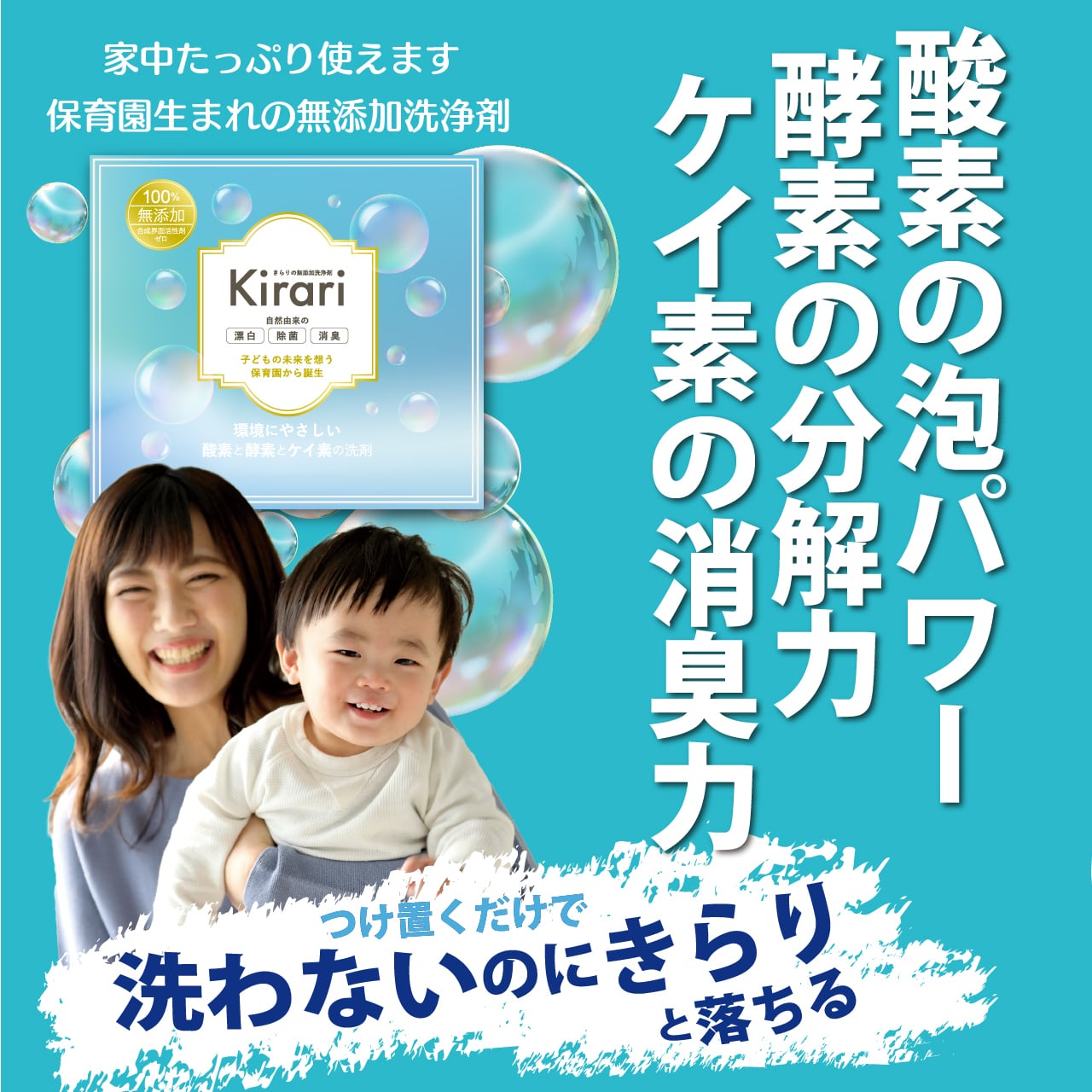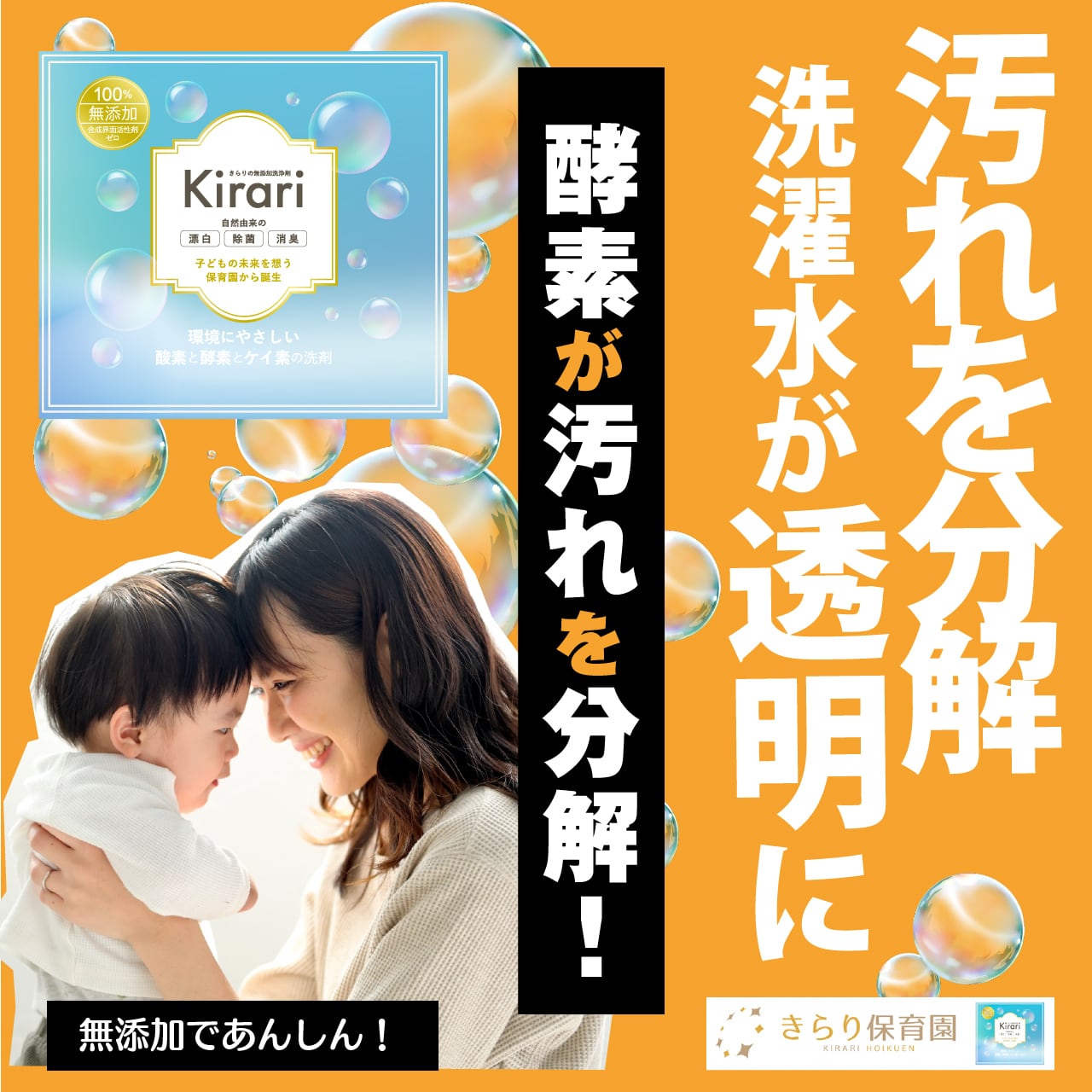 一般的な洗濯洗剤は、汚れを衣類から分離させるだけなので当然お洗濯後の汚水はにごっています。キラリクリーンでつけ置き後の洗浄水はなんと『透明に』なります。これが、酵素の分解力。汚れを単に分離させるだけでなく、汚れそのものを酵素分解しますので洗濯後のお水安心して排水することができます。子どもたちの未来と地球環境を想う保育園生まれのキラリクリーンは『排水もきらり!排水もキレイだから洗濯槽のカビ発生も抑える事につながります!