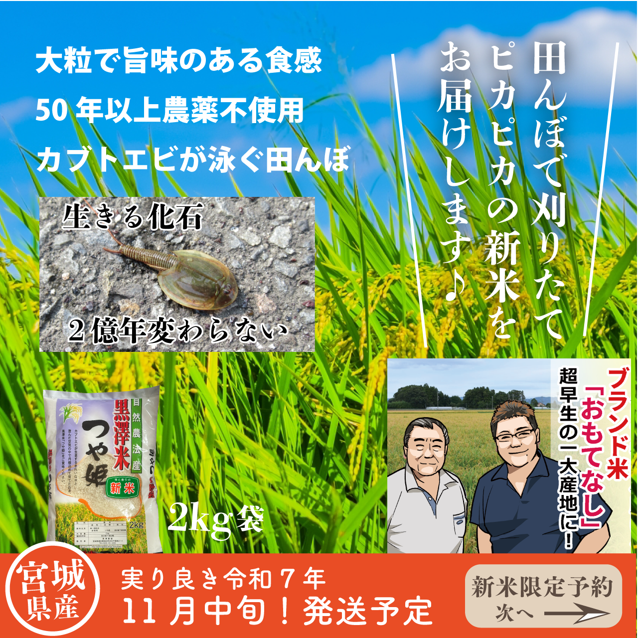 4代50年にわたって農薬や化学肥料を使用せず、自家堆肥を利用。もみで貯蔵しているお米を、受注後に精米してお届けしますので、黒澤米は鮮度が違います。令和7年産の農薬不使用米「黒澤ブランド米」をご紹介します。このつや姫は、農薬不使用・化学肥料不使用で育まれてきた豊かな田んぼから生まれています。本物の有機栽培米であり、その田んぼには生きた化石とも言われるカブトエビが泳ぎ、自然の恵みが詰まった特別な環境が整っています。近年人気が高まってきているつや姫です。炊きたてのの香りと味わいは、心からのおもてなしにぴったりです。日常の食卓はもちろん、大切なお客様を迎える際のお米としてもおすすめです。